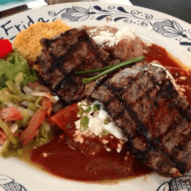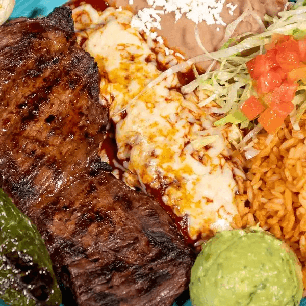 Charbroiled seasoned skirt steak with red enchilada topped with cheese, served with guacamole, rice, beans and tortillas