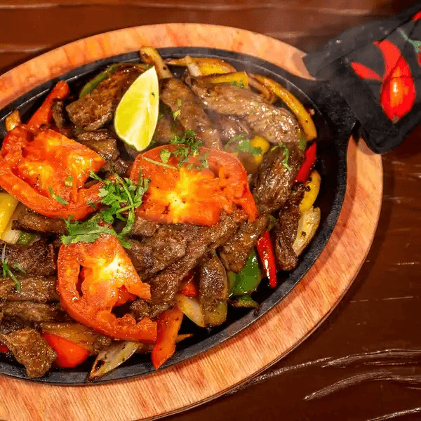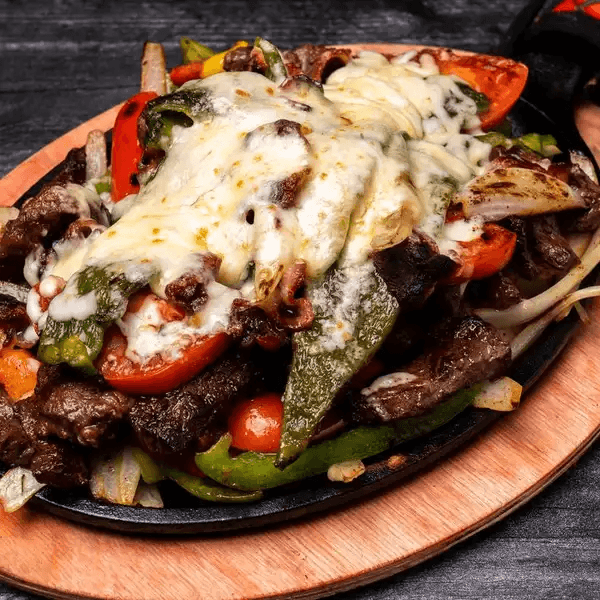 Sizzling platter of caramelized onions, mixed bell peppers, and choice of meat, topped with melted Chihuahua cheese and crispy bacon