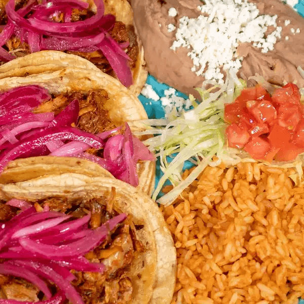 3 pulled pork tacos (Yucatan style) topped with habanero purple onion, served with rice and beans