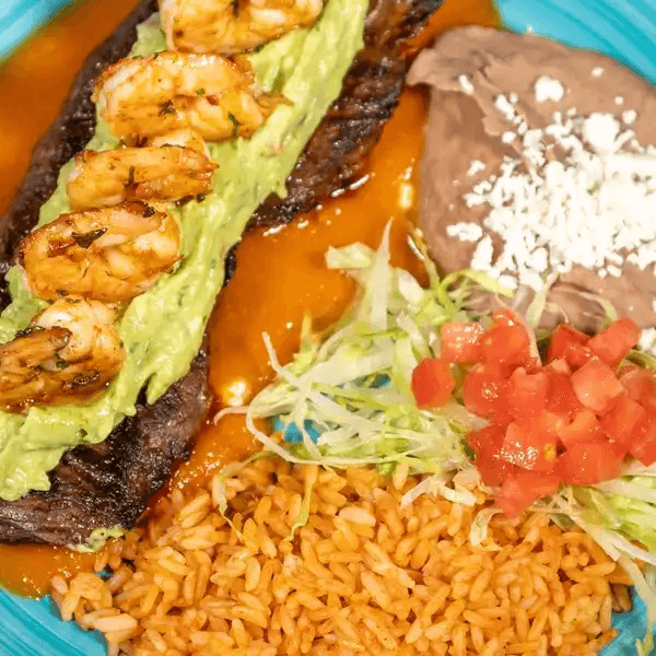 Charbroiled skirt steak served over our ranchero sauce and topped with grilled shrimp, served with guacamole, rice, and beans
