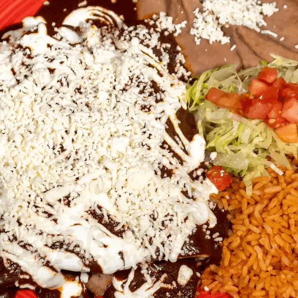 3 enchiladas topped with our signature mole sauce, melted cheese, and sour cream and filled with your choice of meat (steak, al pastor, chicken, ground beef, or veggies)