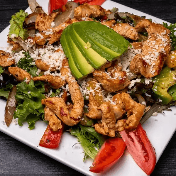 Chicken breast, spring mix, grilled bell peppers, and onions with avocado and cheese