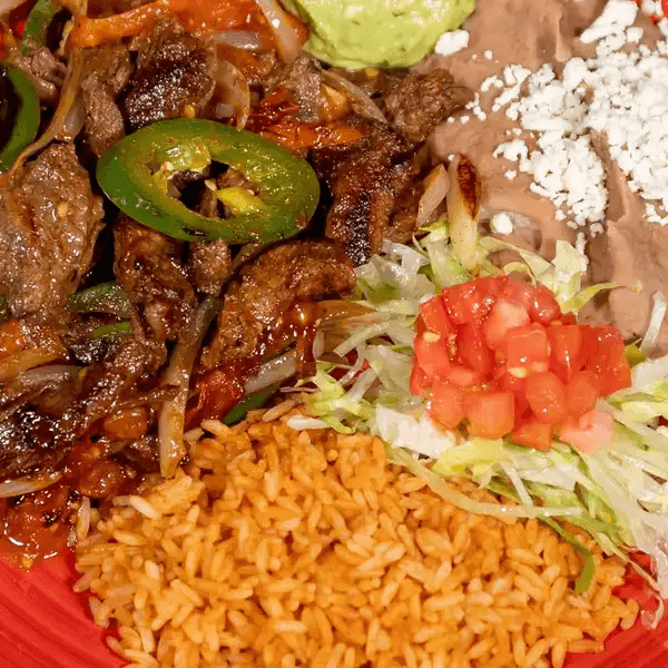 Our specialty rib-eye with grilled onions, grilled jalapeños, cilantro, melted cheese, rice, and beans, served with rice and beans