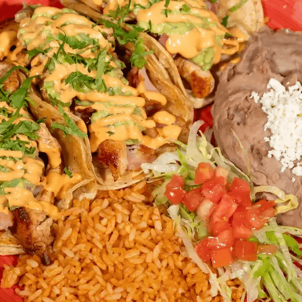 Choice of meat: carnitas, steak, chorizo, chicken tinga, chicken, al pastor, ground beef. 3 tacos served with rice and beans for fries