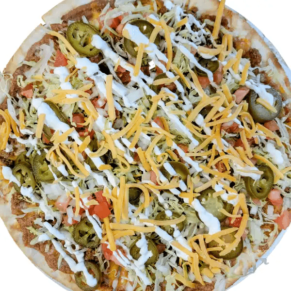 Ground beef, Cheddar, lettuce, tomato, onion, jalapeño, and sour cream